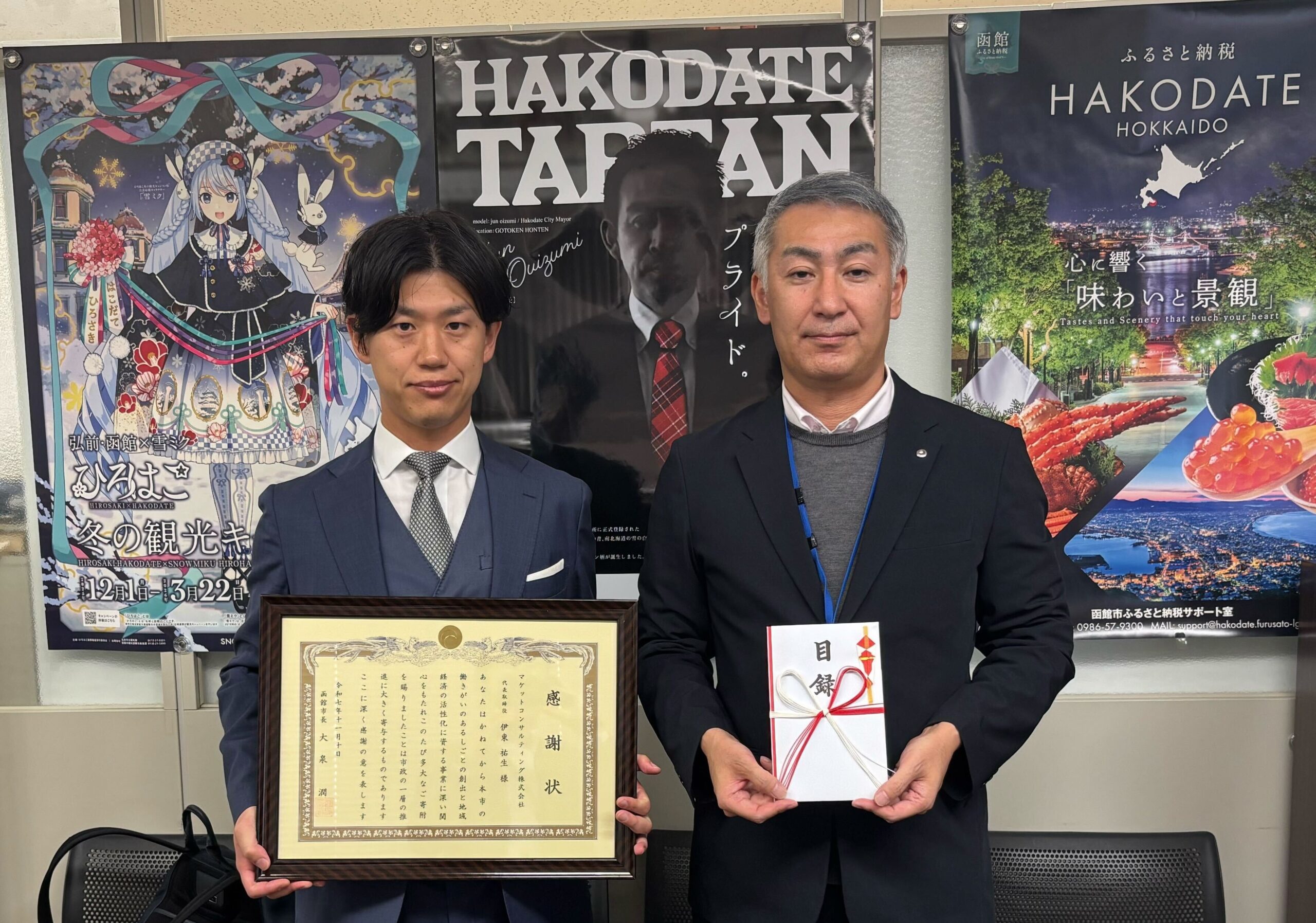 ※写真左からマケットコンサルティング株式会社 伊東代表取締役、函館市経済部 氣田部長